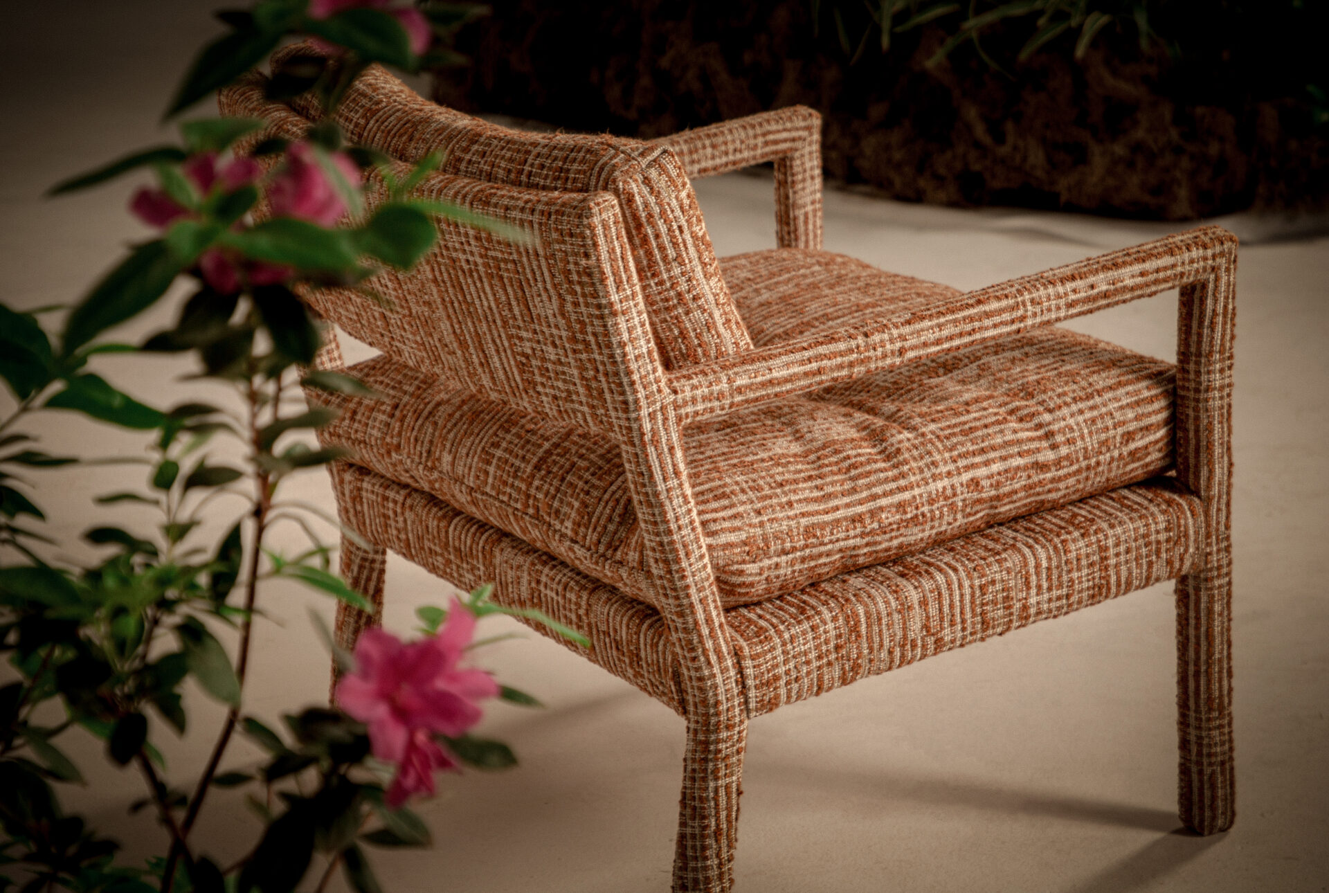 The Auric armchair reveals masterful craftsmanship by embracing the contrast between the rigid structure of its wooden base and the generous volume of the upholstered cushions that form the seat and backrest. This tension between slender, firm lines and the softness of the padded elements creates a balanced aesthetic—blending retro charm with contemporary elegance—resulting in a piece that promises to be timeless.