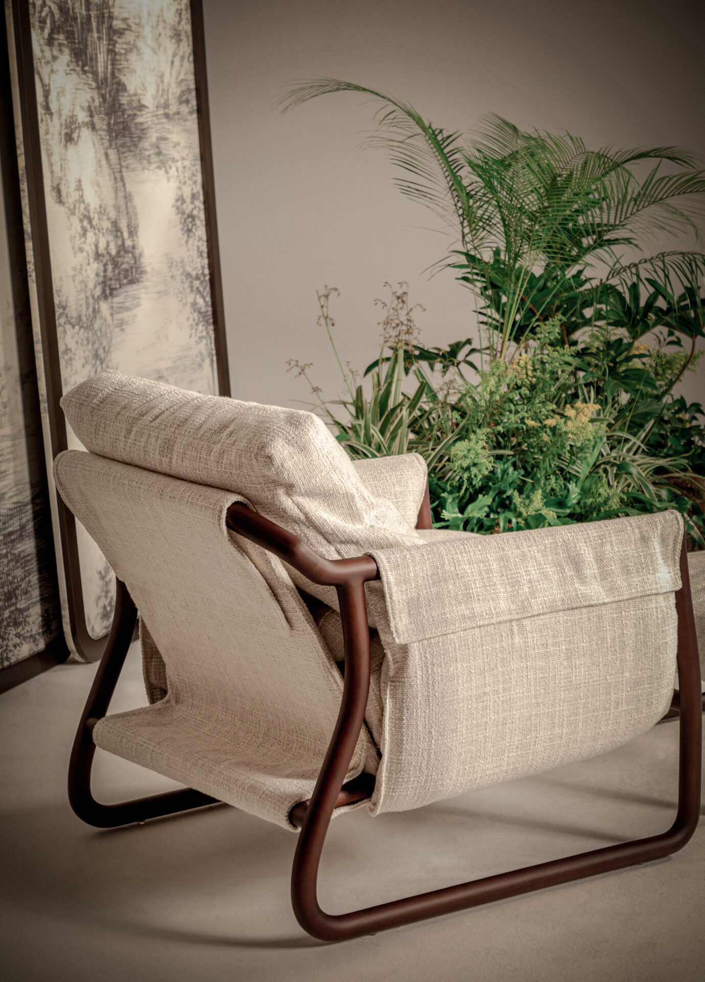 The Boemi armchair has a super comfortable and welcoming essence. Its wooden frame creates soft curves that embrace the body, while the generous upholstery ensures immediate and enveloping well-being. Inviting, the Boemi combines affective memory and contemporary design in a piece designed to create a space where form, materiality, and comfort converge.