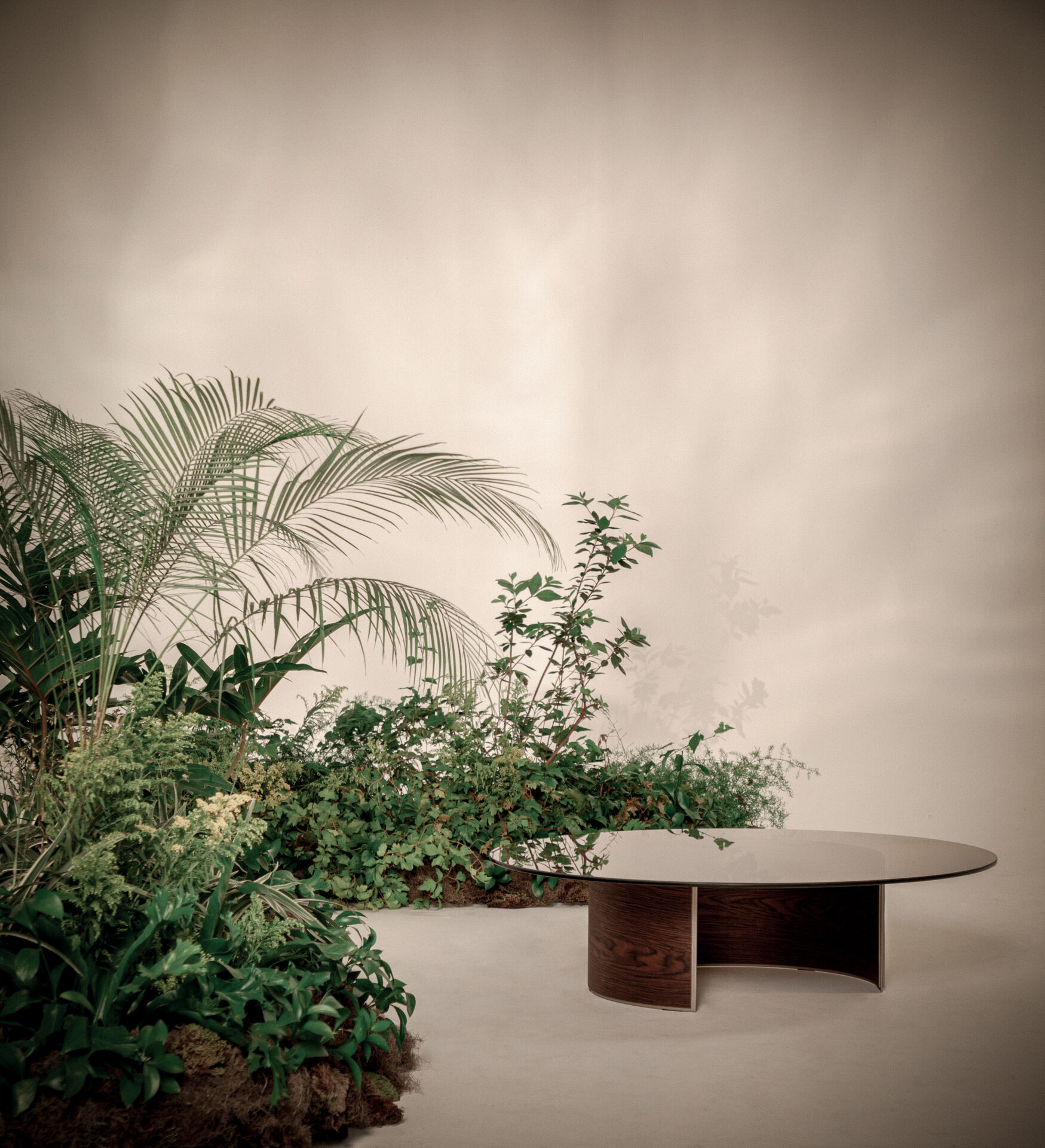 The Fitz coffee table brings an imposing sophistication to contemporary interiors. Featuring a metal accent along the entire edge of the base, its design starts from a sculptural semicircle, built in layers that contrast wood and metal to create rhythm and depth in the piece. Versatile, the Fitz table offers different top sizes and finishes to harmoniously complement a variety of spaces.
