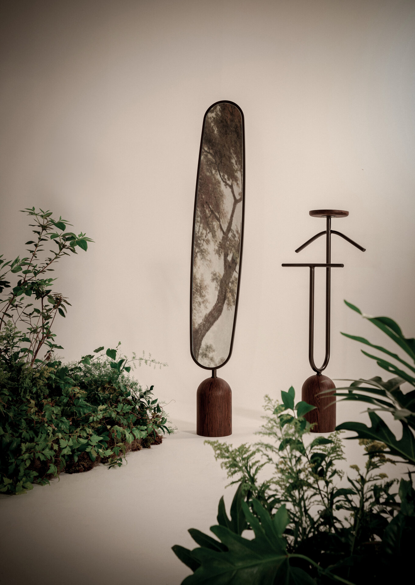 The Sammy line is available in floor mirror and hatstand versions. The pieces, built from an imposing wooden base and metal structures, form a composition that brings touches of Art Deco through the appreciation of the object as a functional sculpture and the elegance of its silhouette.